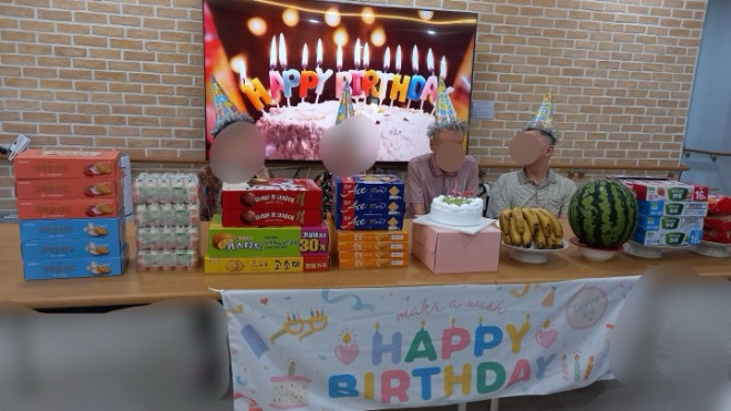 더운 여름에 태어나신 우리 어르신들을 축하해드리고 싶어서 간소하게나마 생신상을 준비했습니다. 모두들 축하해주시기 바랍니다.^^ |